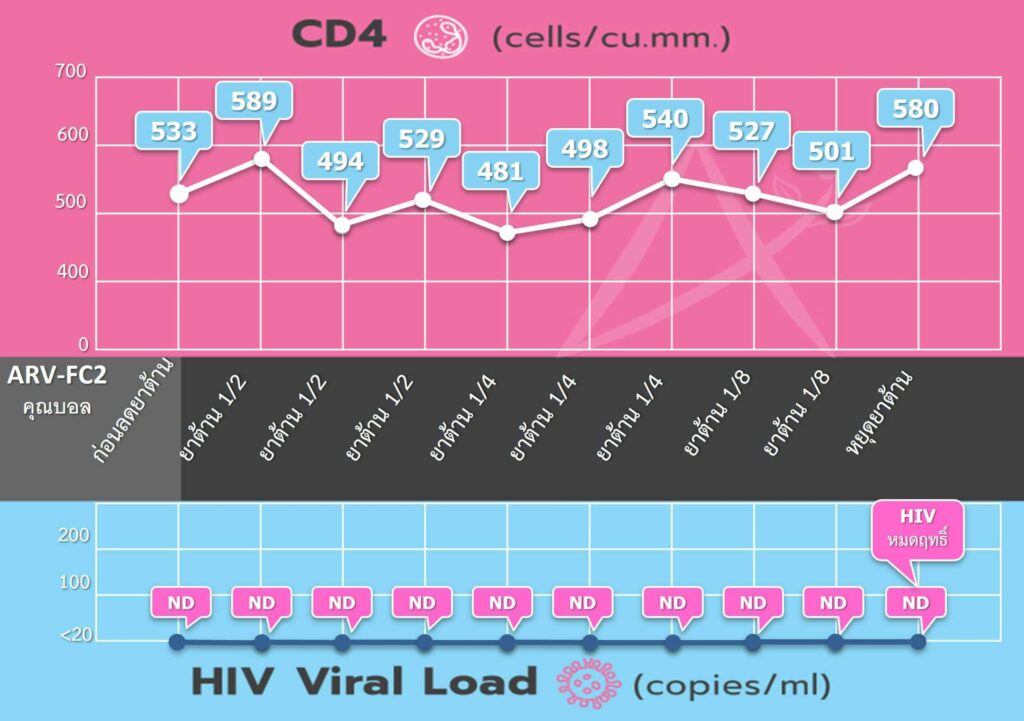 - CD4 เพิ่มขึ้นจาก 203 เป็น 580 cells/cu.mm