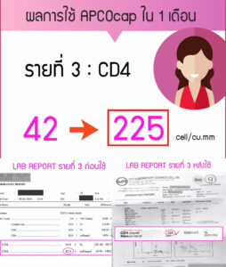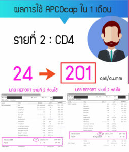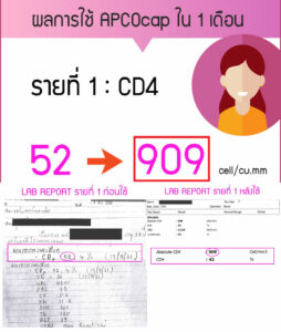 คุณดินผู้ที่เคยติดเชื้อ เอชไอวี ก่อนใช้ภูมิคุ้มกันบําบัด APCO มีค่า CD4 แค่ 4 และค่า HIV 2.5 ล้าน แพ้ยาปฏิชีวนะ จนเกิดโรคผิวหนัง แต่หลังใช้ภูมิคุ้มกันบําบัด APCO เพียง 7 เดือน ค่า CD4 ก็เพิ่มขึ้น HIV ตรวจไม่พบมาต่อเนื่อง หรือ Bye Bye HIV โดยที่ไม่เคยใช้ยาต้าน