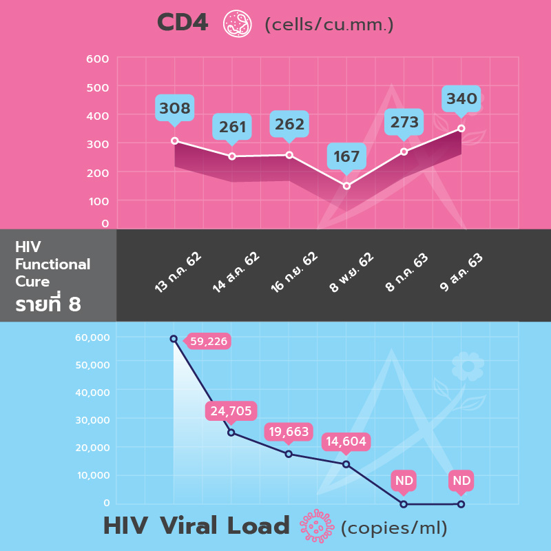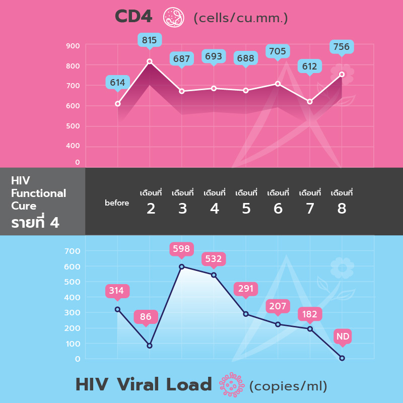 - CD4 เพิ่มขึ้นจาก 203 เป็น 580 cells/cu.mm
